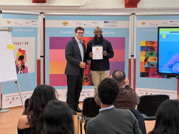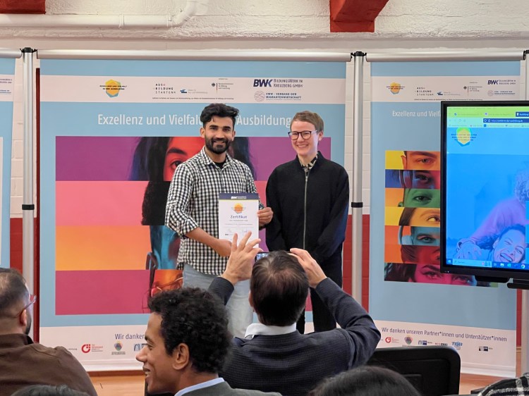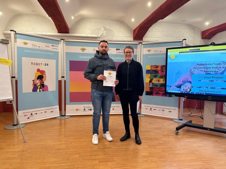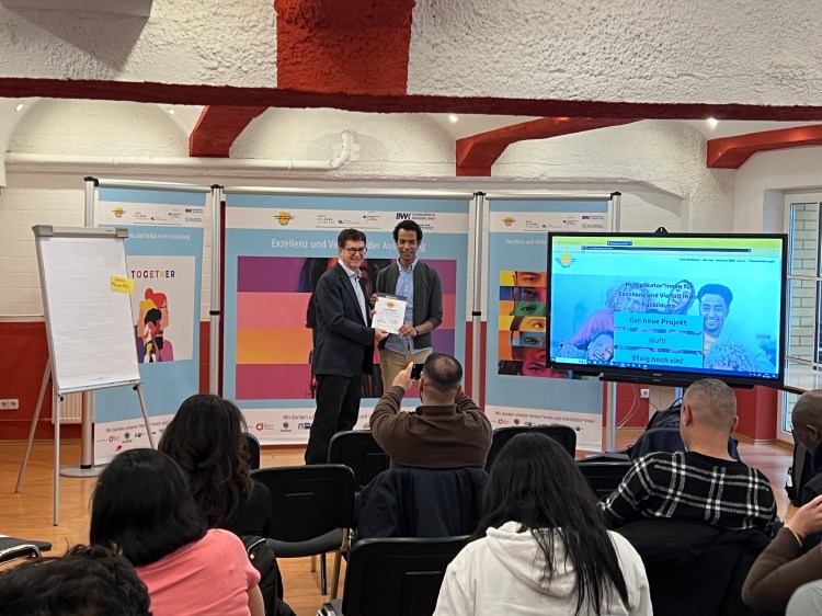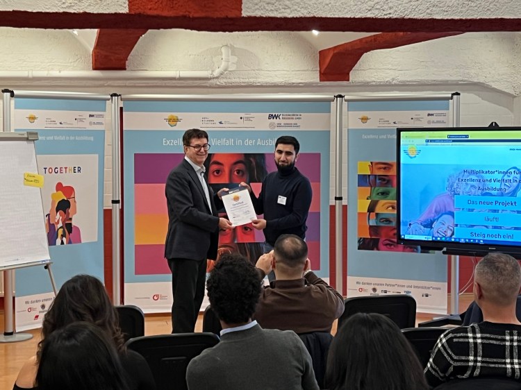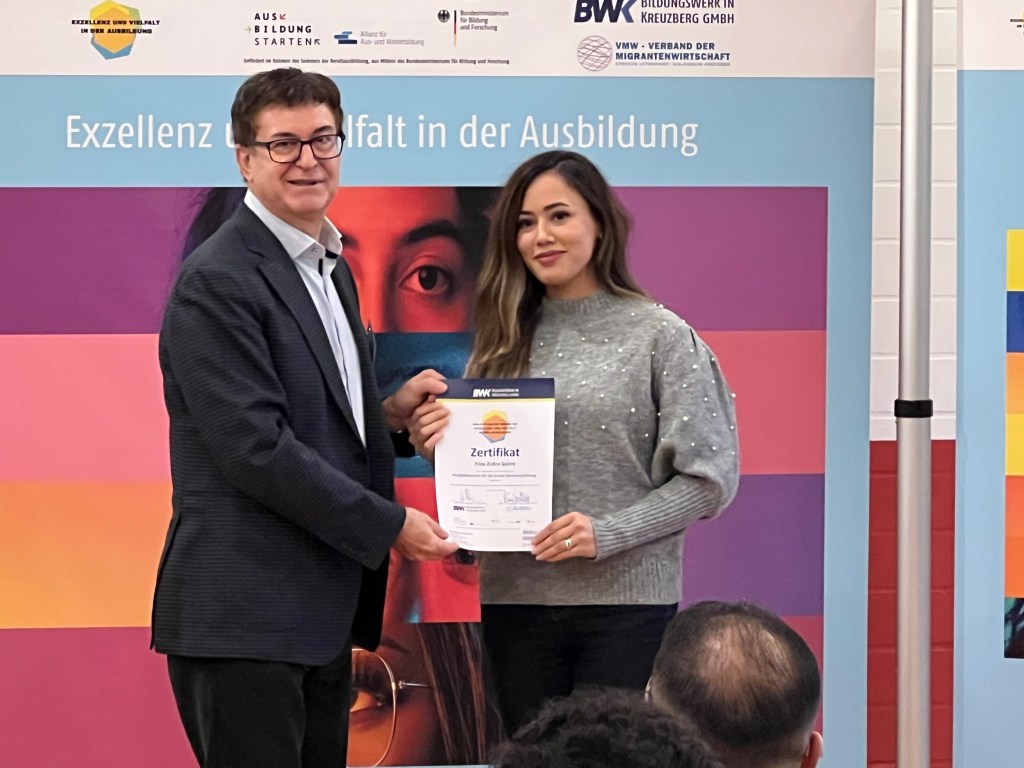 Nihat Sorgec, Geschäftsführer des BWK BildungsWerk in Kreuzberg überreicht einer Multiplikatorin das Zertifikat
